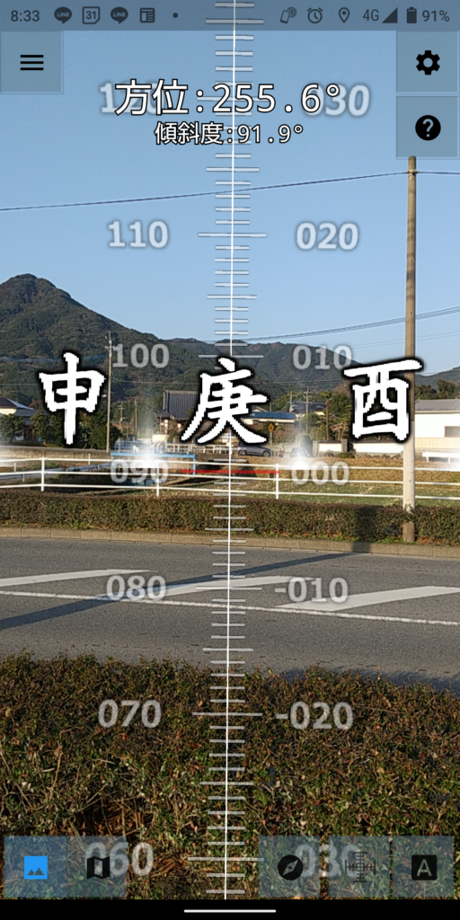 2025年の恵方は「庚」の方角ですので、アプリ画面の 縦線 が「庚」に重なるようにすれば、正確な2025年の恵方を向いたことになります。